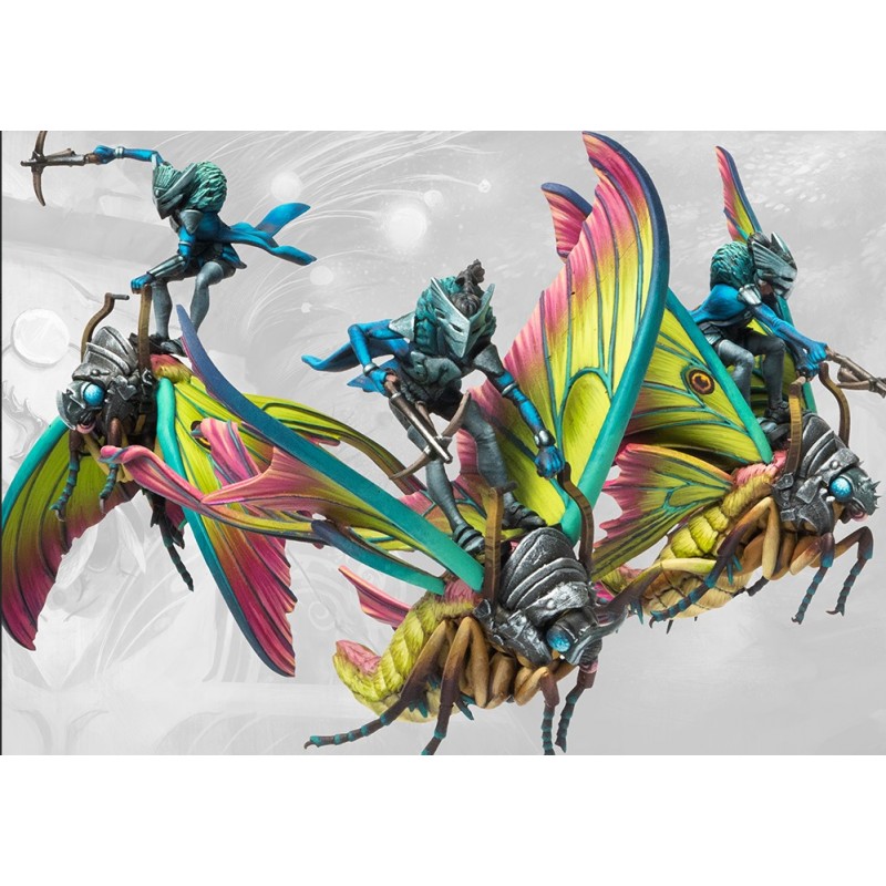 Les papillons Lunopeth ont été apprivoisés et liés il y a des millénaires par les Cours des Tisserands. De longues lignes de ces volants nocturnes sont liées par le destin aux tisserands depuis si longtemps qu'ils sont désormais une partie inséparable de leur société. Le terrain enchevêtré et la verticalité des Domaines des Tisserands se prêtent aux montures volantes. Leurs corps délicats ne se prêtent pas bien aux rigueurs du combat, mais les Tisserands ont compensé cela en armant leurs cavaliers avec des armes à distance. Les Cavaliers Skiathan vont au combat armés d'arbalètes habilement conçues qu'ils peuvent tirer en vol, harcelant l'ennemi sans s'exposer au danger. Les Cavaliers Ciannir, quant à eux, lancent des gousses nocives de graines éveillées sur l'ennemi, équipés pour se protéger de la chute inévitable alors qu'ils jettent leur cargaison mortelle avec l'aide de gants courbés profondément dans les rangs de l'ennemi.