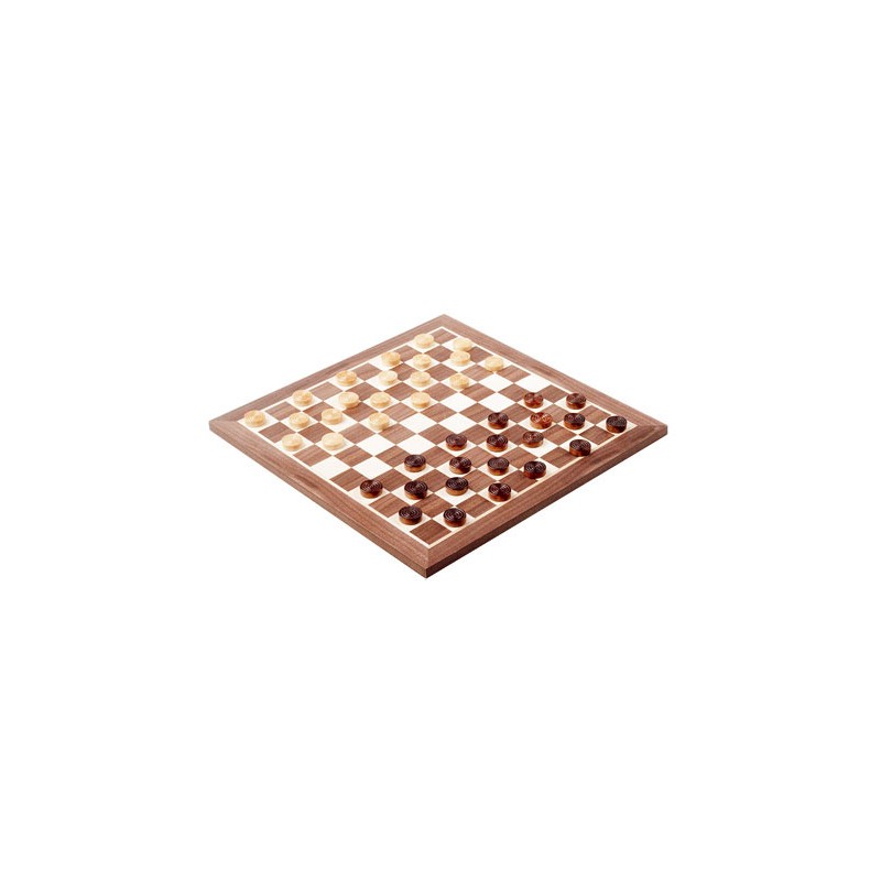 Se joue sur les cases claires. Chaque joueur dispose de 20 pions clairs ou foncés.