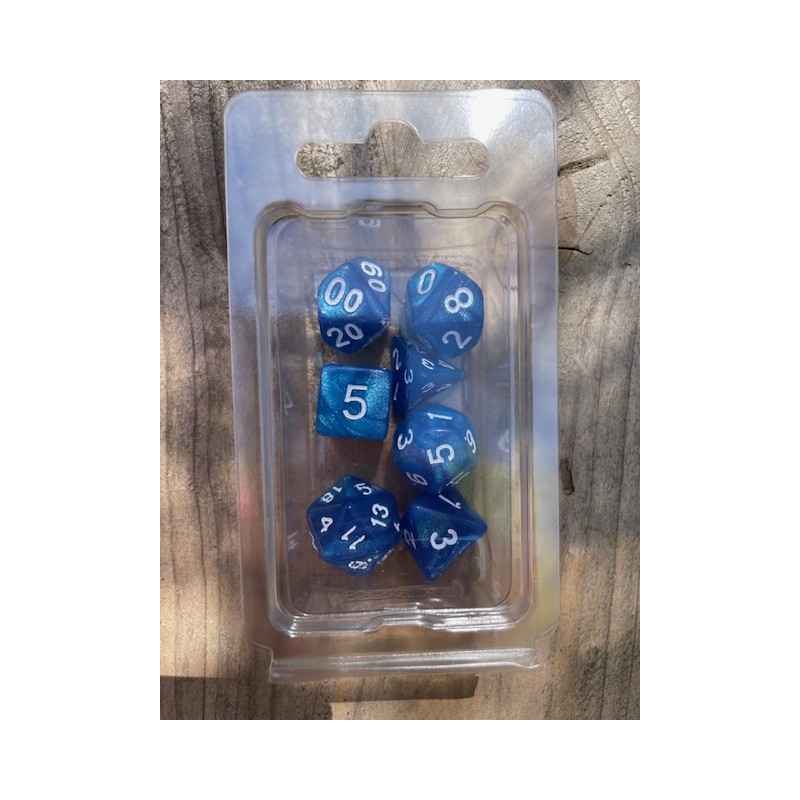 set de 7 dés pailletés bleus écriture blanche