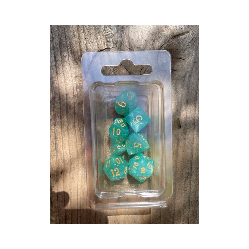 set de 7 dés pailletés menthe glaciale écriture dorée