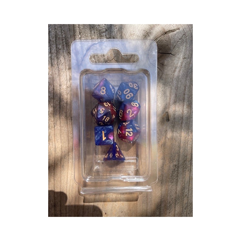 set de 7 dés pailletés bleus et violets écriture dorée