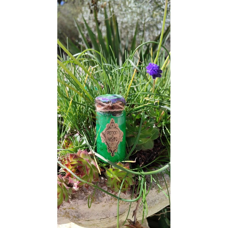 Il s’agit d’une fiole contenant un dé qui flotte magiquement dans un liquide coloré et qui disparait dans des volutes pailletées quand celle-ci est secouée.