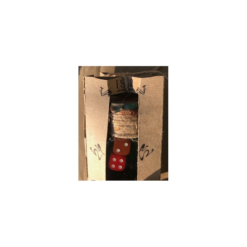 Il s’agit d’une fiole contenant un dé qui flotte magiquement dans un liquide coloré et qui disparait dans des volutes pailletées quand celle-ci est secouée.