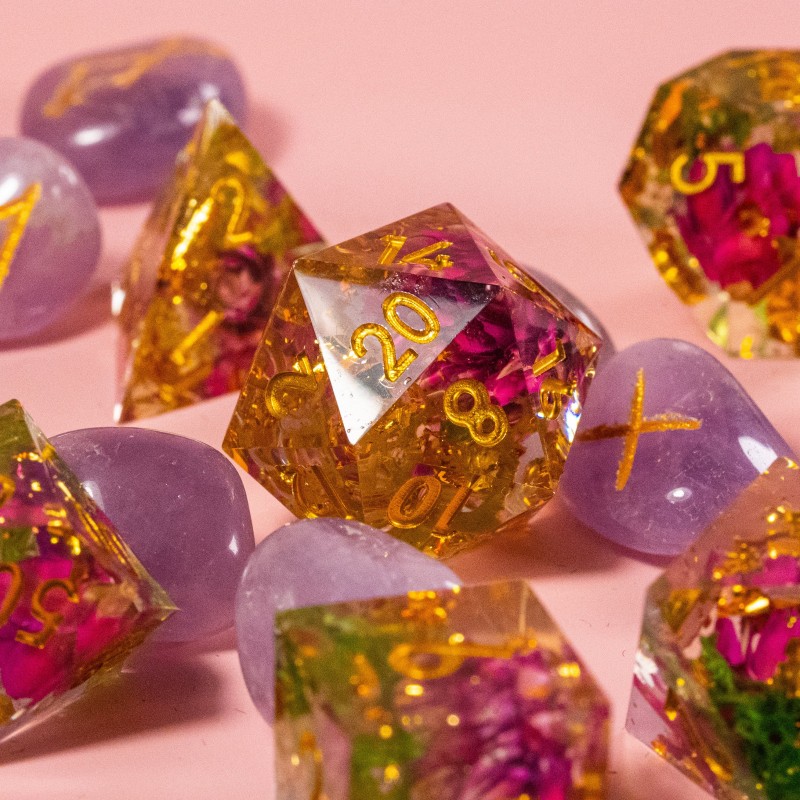 Les Printaniers est un set de dés JDR en résine à bords tranchants.