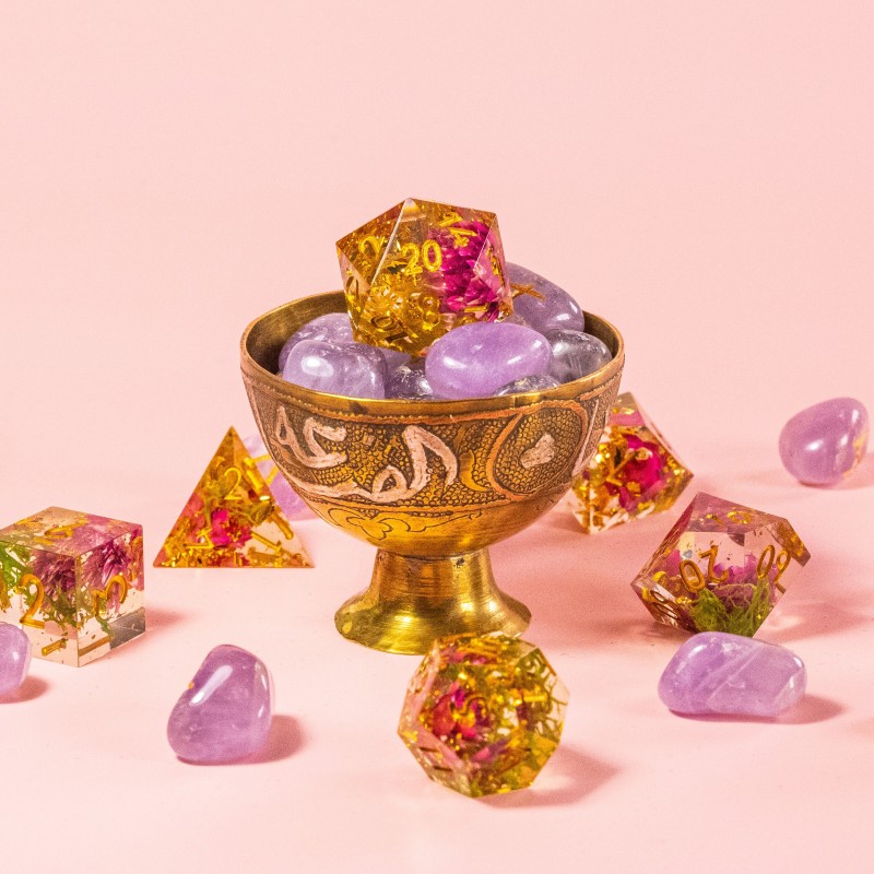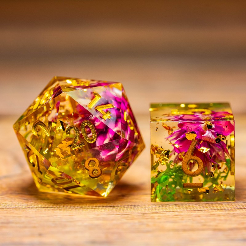 Amenez une touche printanière à chacune de vos parties, et laissez-vous envoûter par la magie florale de ces dés jaunes transparents, ornés d'une délicate fleur rose en leur cœur.
