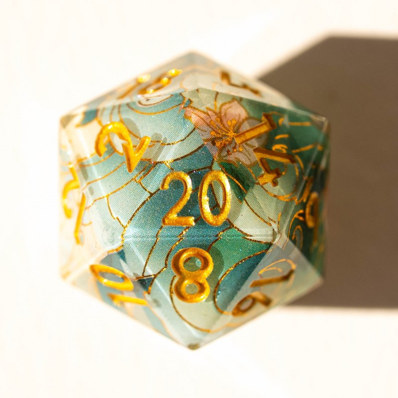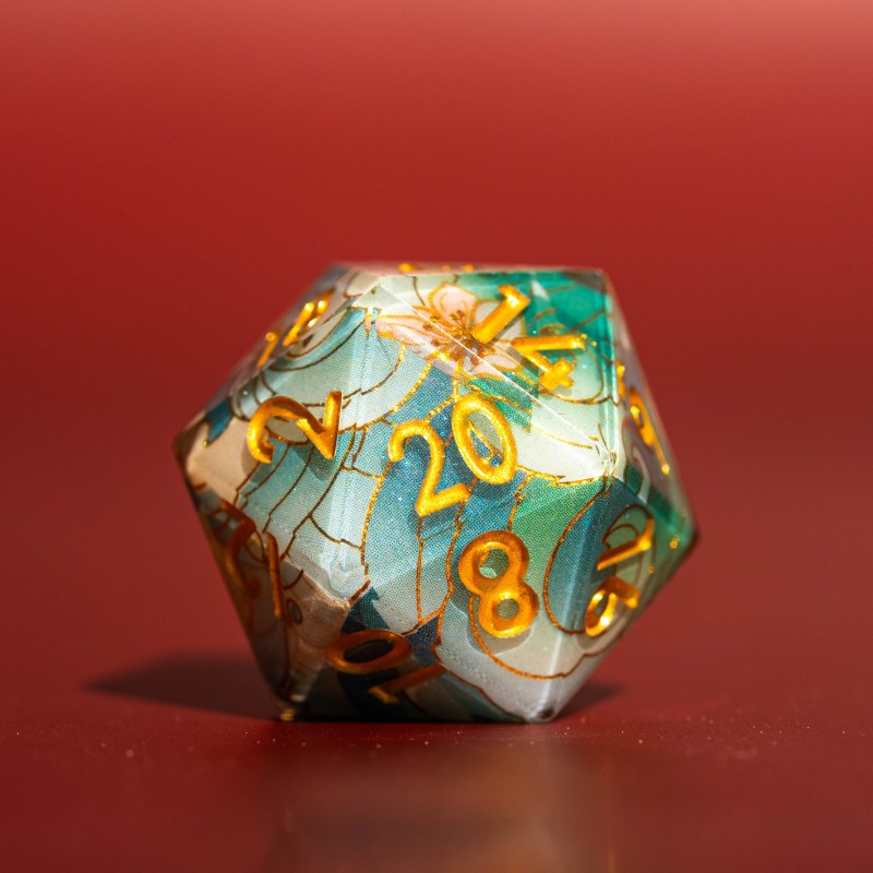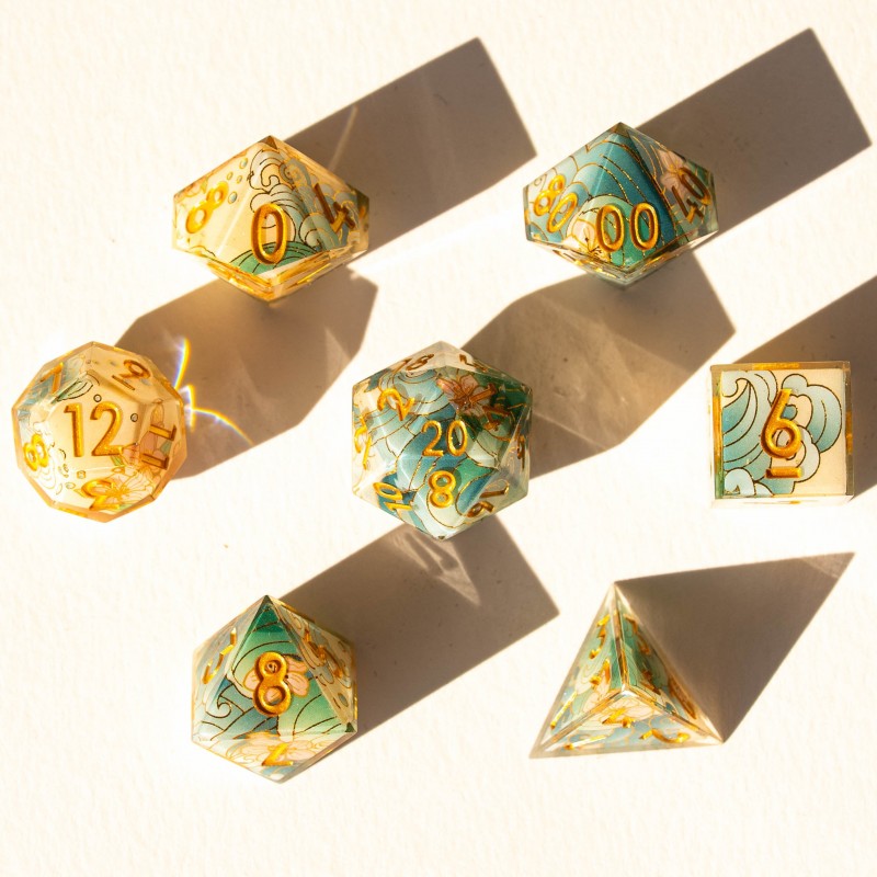 Tsunami Céleste est un set de dés JDR en résine sculptée en strates à bords tranchants.