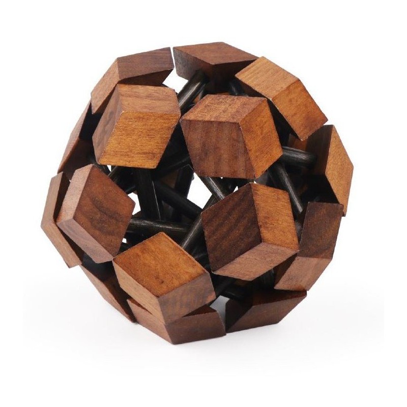 Spheric est un casse-tête en de complexité 5/5 qui mesure environ 10x10 cm. Sa forme sphérique est composée de plusieurs blocs rectangulaires maintenus entre eux à l'aide d'épaisses tiges en bois entrelacées entre elles au cœur de la structure. Le modèle est livré avec sa solution.