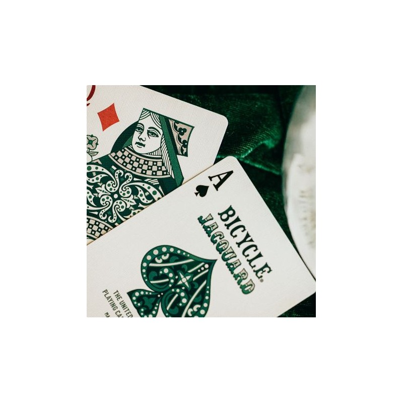 Bicycle Jacquard s'inspire de motifs complexes et ornés, souvent tissés dans du tissu, pour créer de magnifiques présentations. L'étui Bicycle Jacquard présente des détails en feuille vert émeraude et argentée tissés partout, créant un attrait éblouissant et dramatique. Tout comme les machines Jacquard ont révolutionné les métiers à tisser avec leur fonctionnement « chain of cards », ce jeu de cartes haut de gamme a été conçu et fabriqué avec la même sophistication et la même technologie innovante.