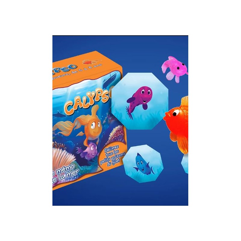 CALYPSO est un jeu de mémoire et votre but est de délivrer le maximum de poissons prisonniers dans un filet perdu au milieu de l'Océan. Evitez Requins et Filets, et retournez le poisson de la bonne couleur au centre du parcours. Restez concentré, car il y a un poisson différent sur chaque face, et le plateau change à chaque fois...