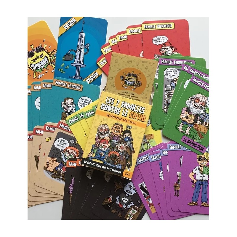 DANS CE VARIANT SATIRIQUE, 7 FAMILLES DÉJANTÉES FONT FACE À LA PANDÉMIE ET AUX RÈGLES SANITAIRES. SOUS LE TRAIT ET L'HUMOUR DE JolK, LES FAMILLES RIENAFOUT, LAICHKÜ, FLIPPET, SAINT-PTÔMES, MAC HABRE, PROFITOMAX ET LEBON-CÔTET, COMPTENT SUR VOUS POUR ÊTRE DECONFINÉE EN ÉCHAPPANT À LA CARTE VIRUS ET EN ESPÉRANT CHOPPER LE VACCIN !