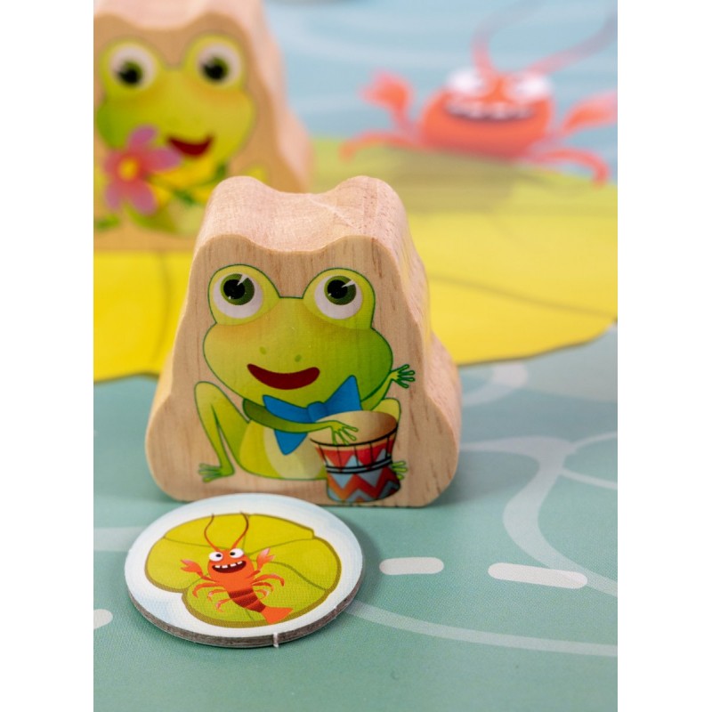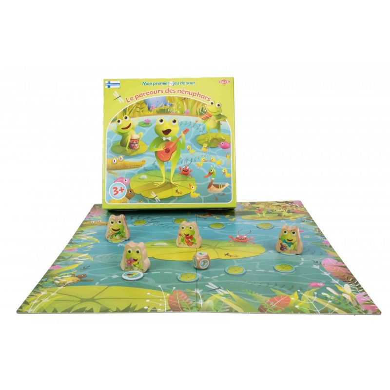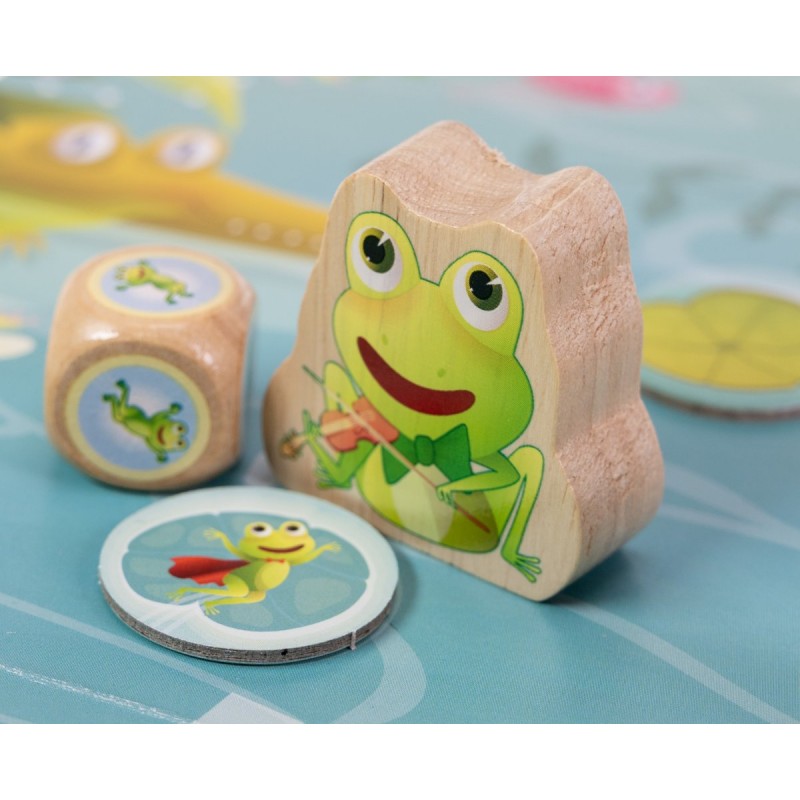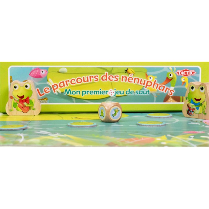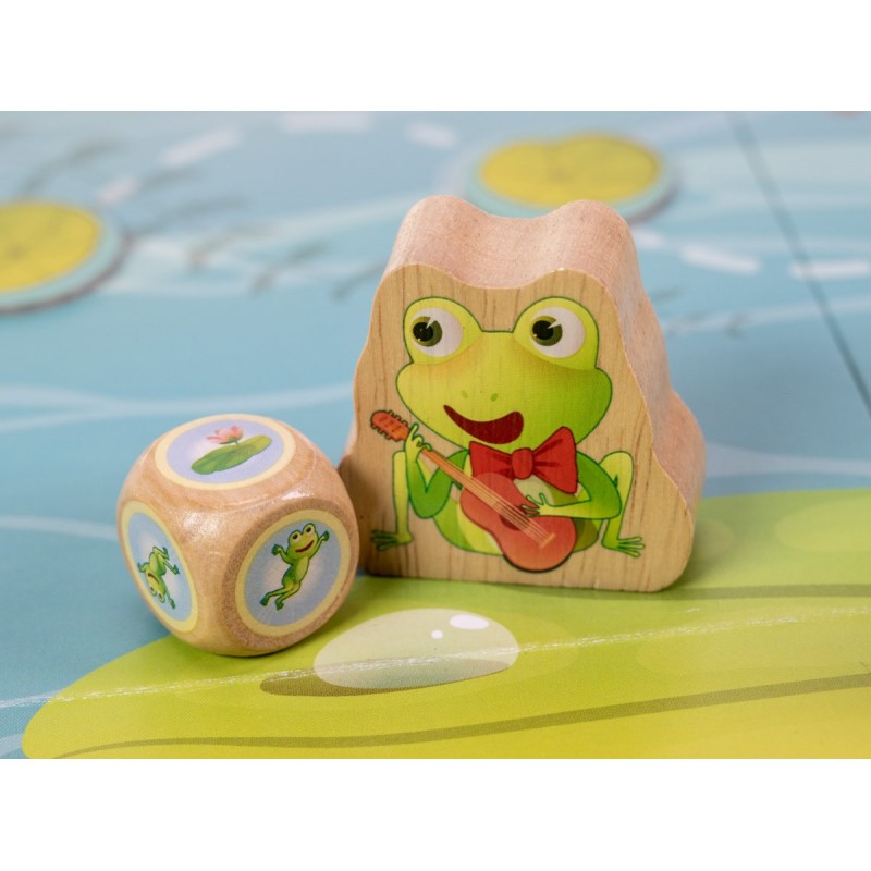 Bondis le long des nénuphars ! Le moment est venu pour les petites grenouilles de rentrer à la maison, mais elles doivent d´abord traverser la mare. Suis le chemin de nénuphars et lance le dé pour voir si tu trouveras une surprise sous le nénuphar sur lequel tu te trouves !