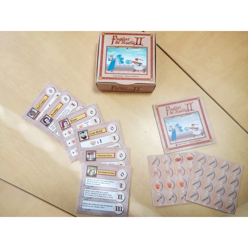 Pugilat de Ruelle propose 6 différents combattants : Rieur, Quaine, Chiourme Lisse, Cent Griefs, Dalle Cime et Jean-Claude Vent D’Âme