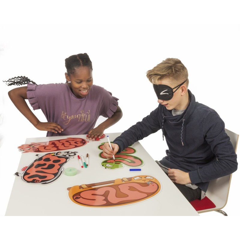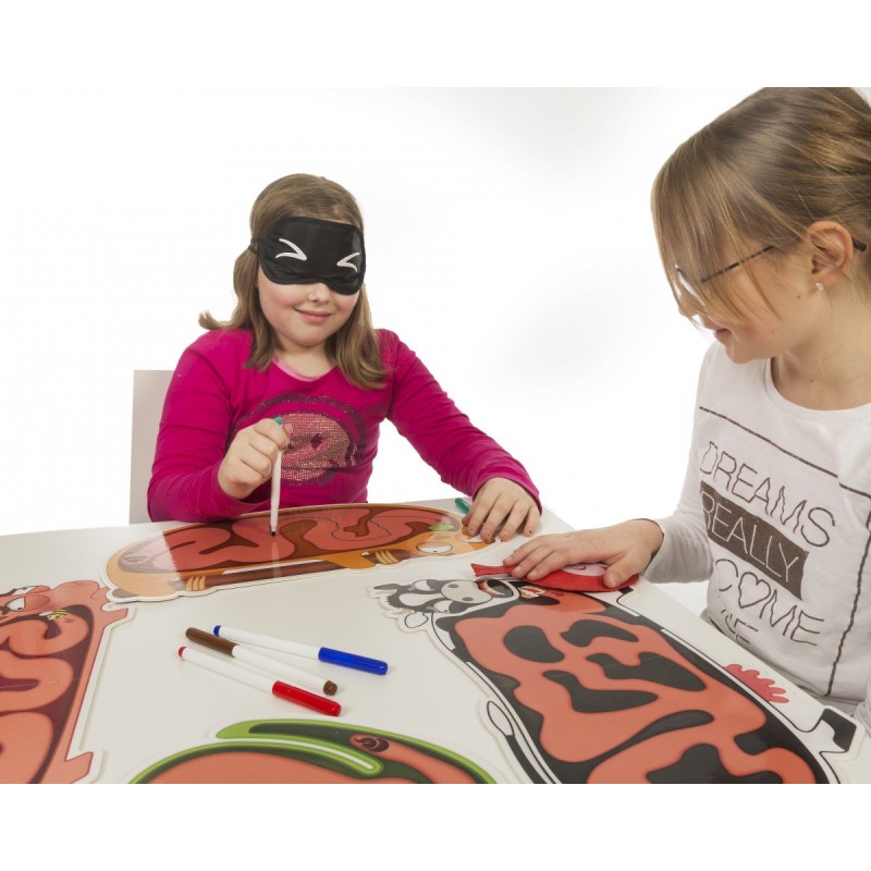 Peux-tu le faire sortir du labyrinthe animal ? Pose ton stylo sur le plateau de jeu, cache tes yeux avec un masque et dessine ! Tu peux continuer jusqu’à ce que quelqu’un presse le coussin péteur pour te faire savoir que tu as dessiné sur les lignes. Le premier joueur à atteindre la sortie du labyrinthe a gagné !
