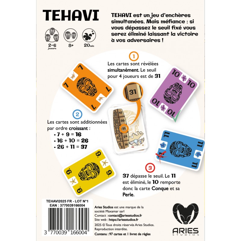 Fort d’une mécanique simple et intuitive, Tehavi offre de nombreux rebondissements et du suspens à chaque tour : le jeu parfait pour des parties uniques et amusantes d'environ 20 minutes.