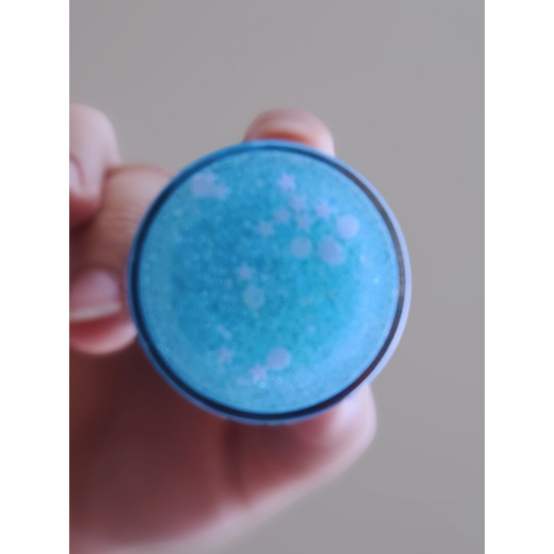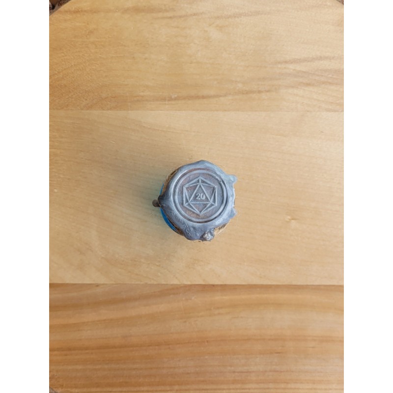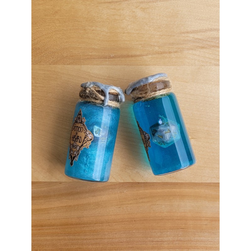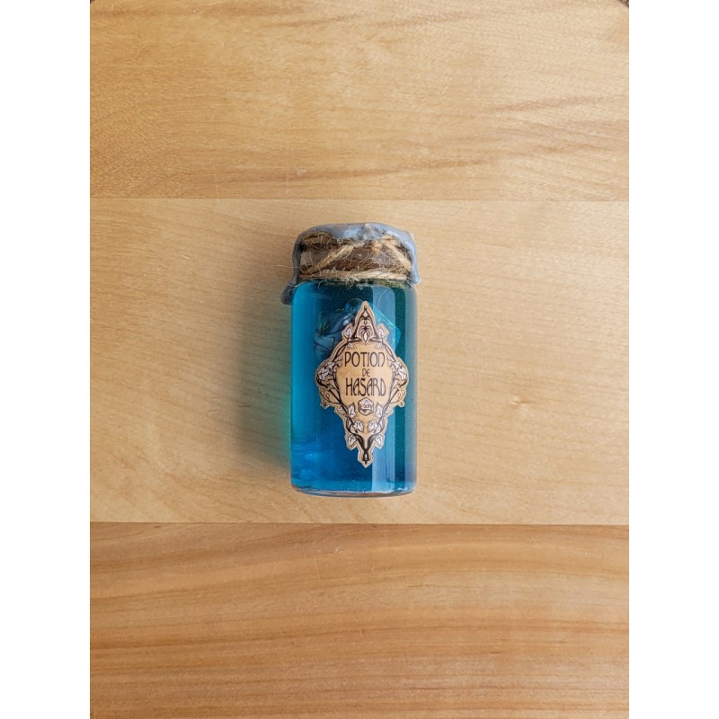 Il s’agit d’une fiole contenant un dé qui flotte magiquement dans un liquide coloré et qui disparait dans des volutes pailletées quand celle-ci est secouée.