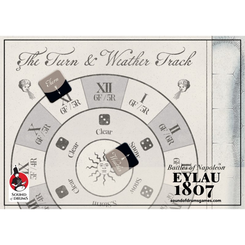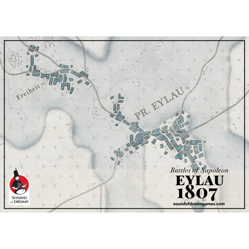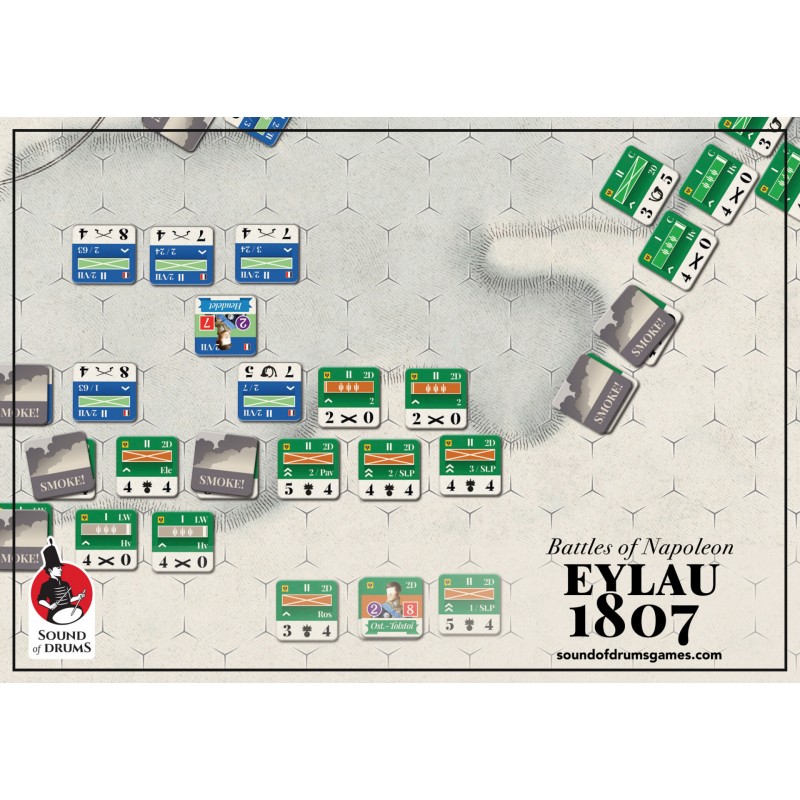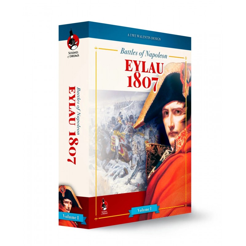EYLAU 1807 contient 1120 grands pions (15 mm), 280 pions alternatifs, 2 grandes cartes (chacune 86 x 55 cm) avec de grands hexagones, 4 cartes et tableaux, 125 cubes en bois, 2 plateaux de pions, 1 manuel de règles et 4 dés personnalisés.