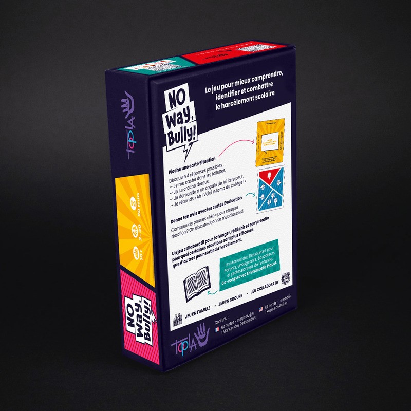No Way, Bully ! est un jeu collaboratif co-conçu avec Emmanuelle Piquet, pour les enfants et adolescents de 10 à 18 ans — du CM1 à la Terminale.