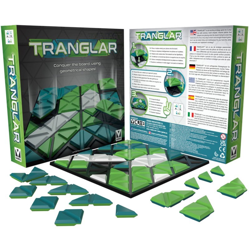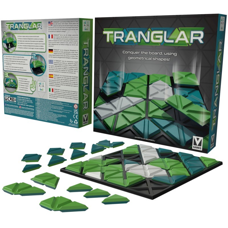 TRANGLARTM est un jeu de stratégie abstrait pour 2 joueurs avec des pièces colorées de formes diverses que les joueurs placent sur le plateau. Il s'agit d'un jeu simple mais intelligent, conçu pour mettre au défi les joueurs débutants et expérimentés.